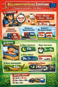 La conduite est strictement encadrée pour éviter la fatigue au volant. Selon la RSE, trois niveaux de contrôle s’appliquent :
